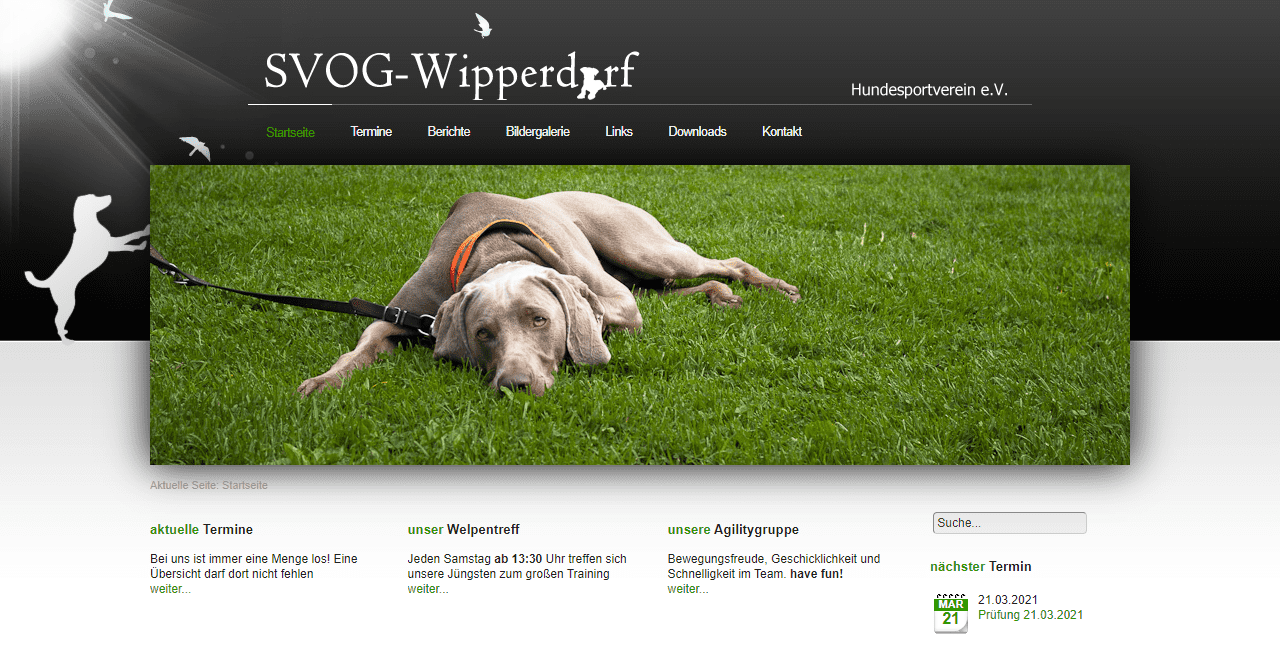 Die alte Seite war wie eine klassische Webseite aufgebaut. Es gab unterschiedliche Content Seiten, einen Downloadbereich, Bilder, Berichte und natürlich den Countdown zur nächsten Veranstaltung. Wir wissen, dass das der wichtigste Punkt war, warum Leute die Webseite besucht haben. Natürlich dient die Webseite auch für Informationen. Informationen für neue Leute und Mitglieder. Wann waren noch einmal die Trainingstage? Um welche Uhrzeit startet die Welpenstunde? All diese Fragen sollen auch weiterhin auf dieser Seite beantwortet werden.